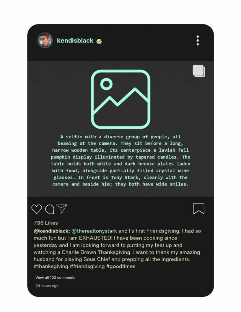 A selfie with a diverse group of people, all beaming at the camera. They sit before a long, narrow wooden table, its centerpiece a lavish fall pumpkin display illuminated by tapered candles. The table holds both white and dark bronze plates laden with food, alongside partially filled crystal wine glasses. In front is Tony Stark, clearly with the camera and beside him is Kendis Black; they both have wide smiles.