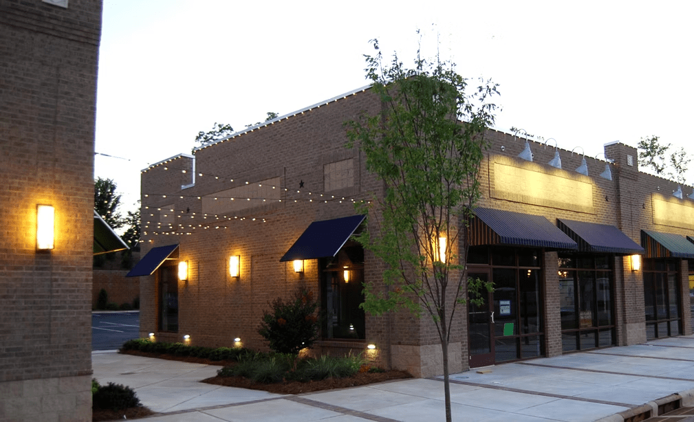 Restored 1920s brick façade with neon signage that glows pink, gold, and violet at night